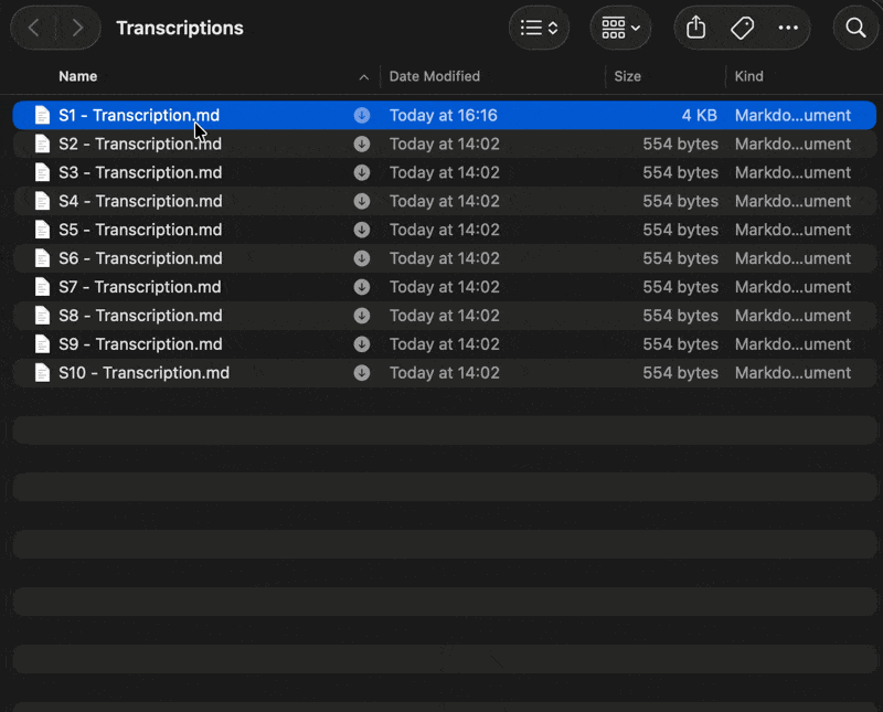 - Step one > main body > creates “S1 - Transcription.md”.
